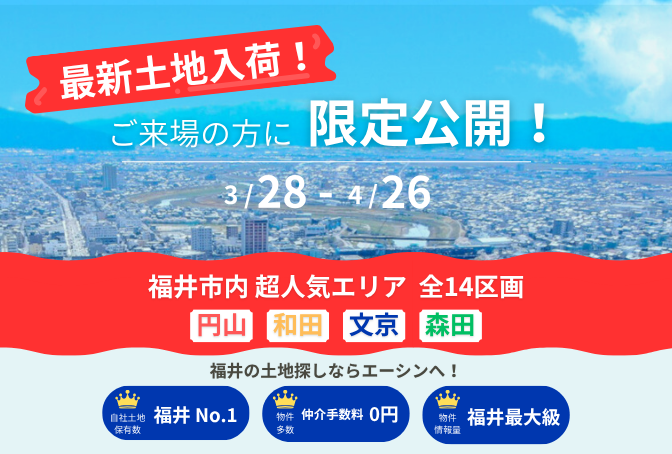 福井市内の超人気エリア「和田・円山・文京・森田」を含む、全14区画が新たに入荷!