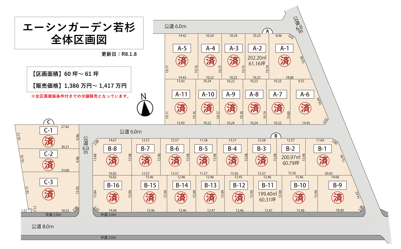 | 建築条件付き | A-2 | 1,394.4 万円 | 61.16 坪 | 22.8 万円 |